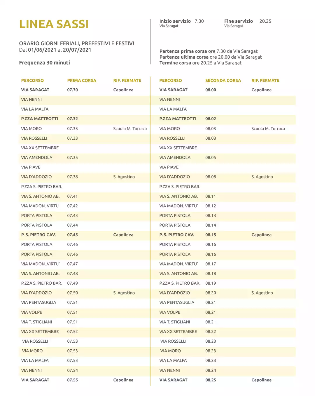 Il bus cittadino che raggiunge la zona dei Sassi effettua dalle 7:30 alle 20:25 circa, fermate in diverse delle zone nevralgiche dei rioni Sassi : via Madonna delle Virtù, Porta Pistola, Piazza San Pietro Caveoso: Gli orari precisi delle corse e le fermate sono visibili nell’immagine in basso.